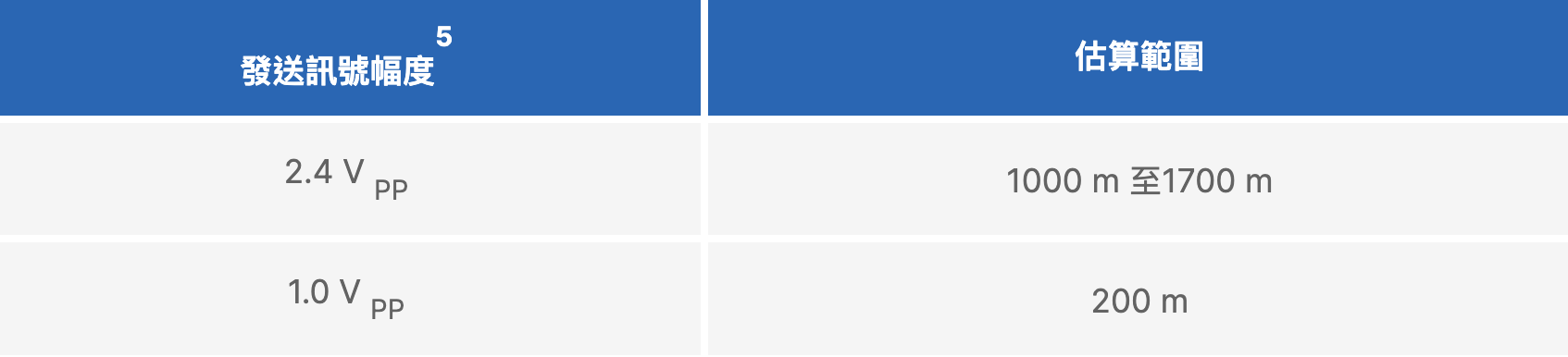 表 4. 單對乙太網路的範圍取決於傳送訊號振幅