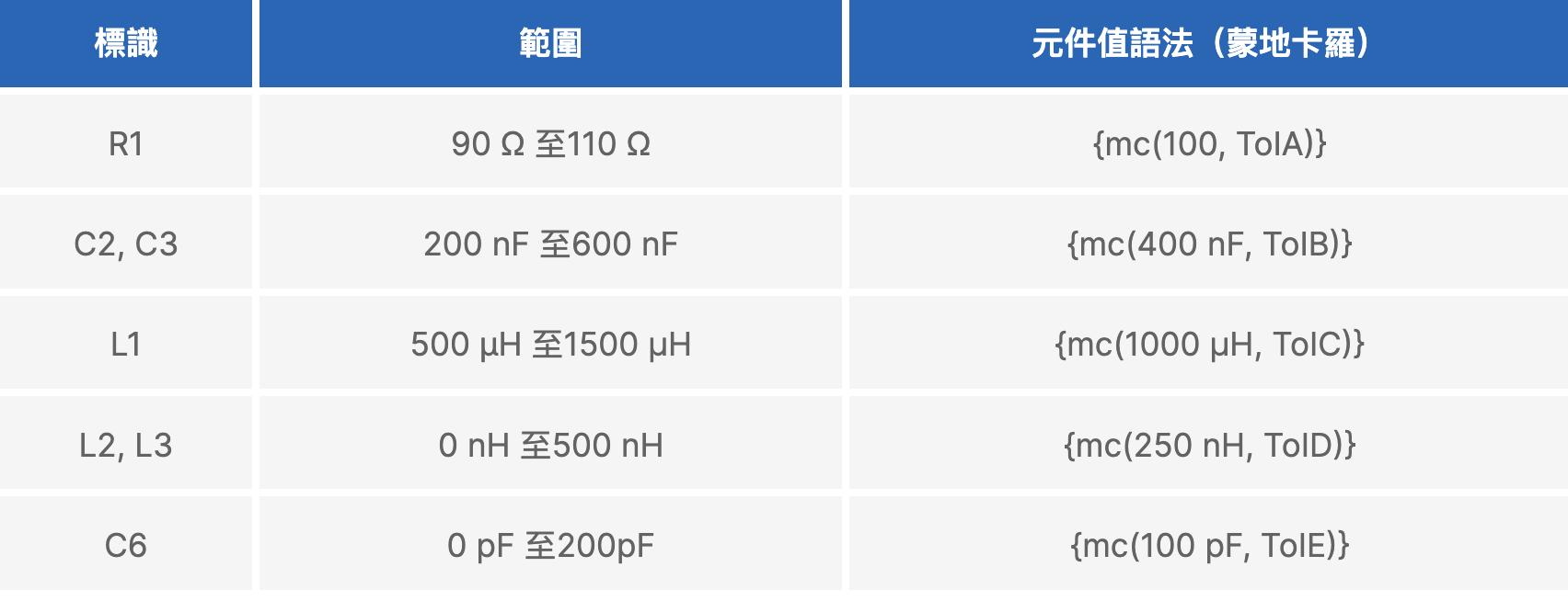 表 1. 使用蒙地卡羅方法定義元件值和容差標識範圍
