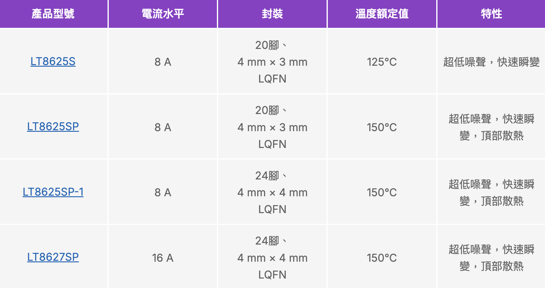 實現快速暫態電源軌最直接的方法之一是選擇具有快速暫態性能的穩壓器。Silent Switcher 3 系列 IC 具有極低頻輸出雜訊、快速暫態響應、低 EMI 輻射和高效的特性。它採用超高性能誤差放大器設計,即使採用激進的補償方法也能提供額外的穩定性。4 MHz 的最大切換頻率使 IC 能夠在固定頻率峰值電流控制模式下將控制迴路的頻寬推至 50 kHz 的範圍。表 1 列出了設計人員可以選擇用以實現快速暫態性能的 Silent Switcher 3 IC。