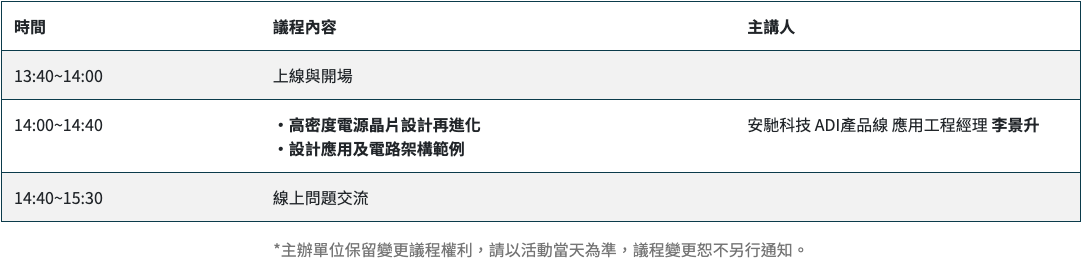本場線上研討會,將由安馳科技應用工程部李景升經理,為您更深入介紹ADI的高密度電源晶片,幫助您一馬當先,設計出業界最前端的產品。
