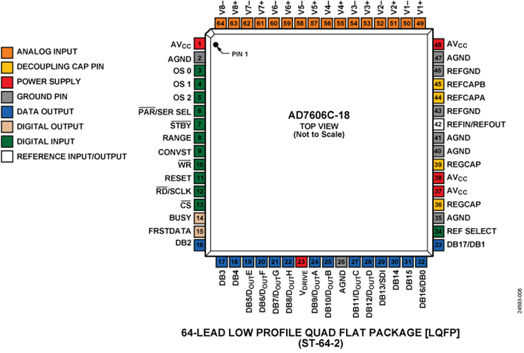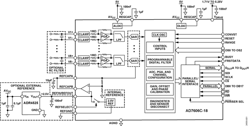 輸入箝位保護可承受高達 ±21 V 的電壓。因採用單電源供電、晶片內建濾波和高輸入阻抗設計,增設外部驅動器運算放大器的需要,後者需要雙極性電源。對於吞吐速率較低的應用,可以使用AD7606C-18靈活數位濾波器來提高雜訊性能。