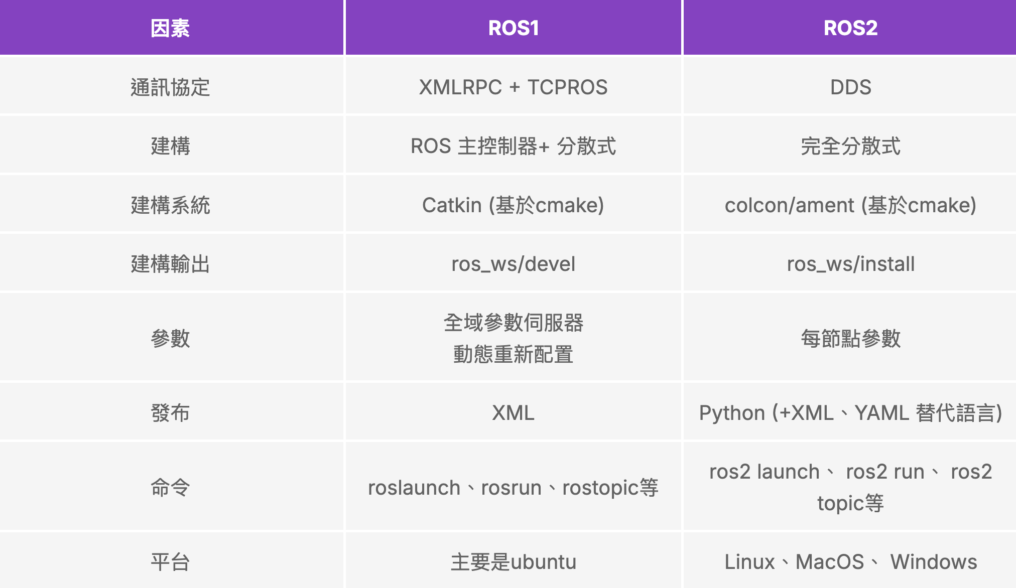 表 1. ROS1 和 ROS2 的主要差異