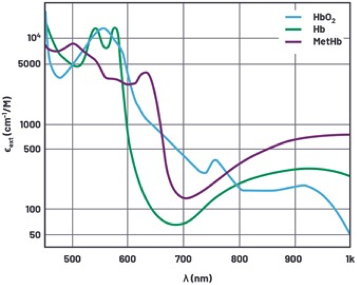 Beer-Lambert 定律解釋了光在穿過吸收性材料時呈指數衰減。這可用於確定含氧血紅蛋白與總血紅蛋白的水平。