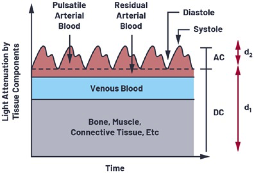 信號包含直流和交流分量。直流分量是由於皮膚、肌肉和骨骼以及靜脈血等不斷反射的物質造成的。當身體處於靜止狀態且運動不太重要時,交流分量主要包括來自動脈血脈動的反射光。AC 分量取決於心率和動脈厚度,收縮期(泵)的反射或透射光多於異位(鬆弛)。在收縮期,血液從心臟泵出,這會增加心房血壓。血壓升高會使動脈擴張並導致心房血容量增加。血液中的這種增加導致光吸收的增加。舒張期血壓下降,因此光的吸收也下降。