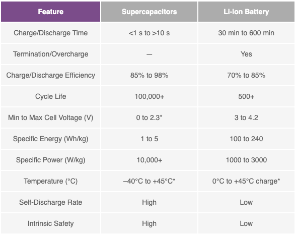 表 1. EDLC 和鋰離子電池的比較