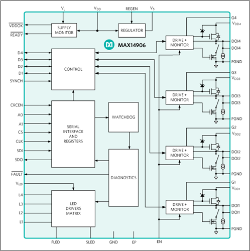MAX14906採用小巧的48引腳7mm x 7mm QFN封裝。