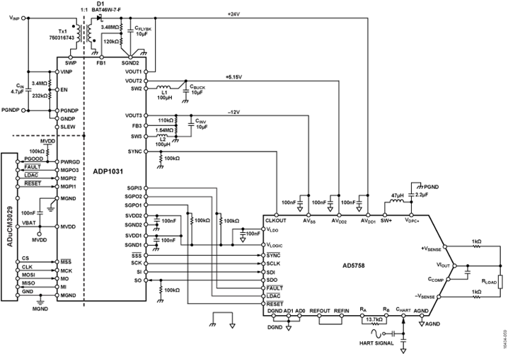 ADP1031 的輸入電壓範圍為 +4.5V 到 +60V,可生成隔離的輸出電壓 +6V 到 +28V (可調版本) 或 +21V 和 +24V (固定版本) 用於 VOUT1,出廠可編程電壓 +5.15V、+5.0V 或 +3.3V 用於 VOUT2,可調出電壓 −24V 到 −5V 用於 VOUT3。