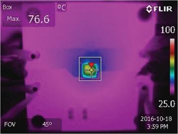 圖3. LTM4661的熱圖像:3.3 V輸入,12 V、0.8 A輸出,200 LFM氣流,無散熱器。