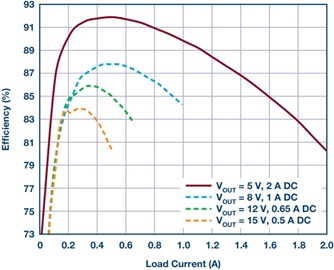 LTM4661效率很高,從3.3 V輸入升壓至12 V輸出時,效率高於87%。效率曲線參見圖2。