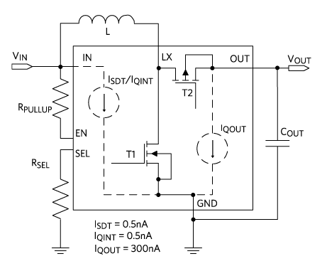 如果使用上拉電阻進行啟用/停用操作,True Shutdown模式下的上拉電流也必須納入計算。相反,如果啟用(EN)引腳由由一個由不同電源驅動的推挽外部驅動器驅動,則沒有上拉電流,關機電流僅為0.5nA。