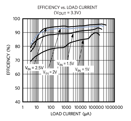 圖4 顯示了 MAX17222 在不同 VIN 值下,VOUT = 3.3V 時的效率。低靜態電流設計將卓越的效率性能延伸到幾微安的負載電流。