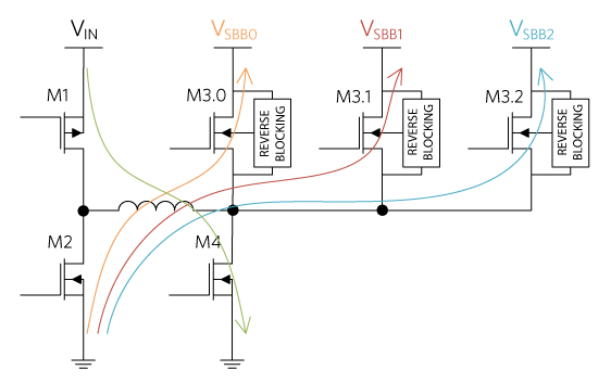 圖3顯示了SIMO拓撲的簡化圖。圖4顯示了SIMO操作的電感器電流波形示意圖。SIMO採用不連續電流控制模式。在MAX77654 SIMO中,它可以在降壓或降壓升壓模式下運行,以支持0.8V至5.5V的廣泛輸出範圍。例如,在降壓升壓模式下,電感器通過M1和M4的導通以VIN/L的速率建立電流進行一個周期。當達到為所服務的輸出軌道編程的相應峰值電感器電流限制時,電流隨後通過M2和M3.x晶體管傳遞到該軌道。