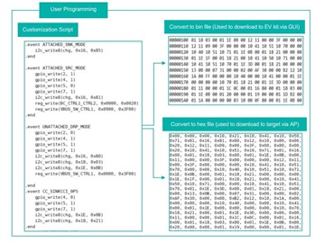 設計人員可以使用圖形化使用者介面(GUI)為典型應用產生客製化腳本,然後將其載入到IC的非揮發性記憶體中。PD控制器可自動執行指令,例如切換GPIO,或透過 I2C 主埠向充電器發送 I2C 指令等。