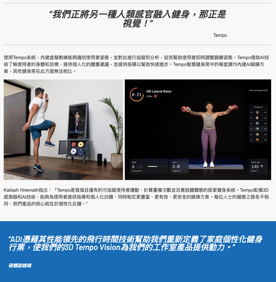 Tempo硬體副總裁Kailash Hiremath表示:「我們感謝ADI在產品開發過程中所提供的技術專長及支援。憑藉ADI公司的先進技術,我們得以將下一代Tempo 3D Vision推向市場,為客戶創造市場前沿的健身體驗。”