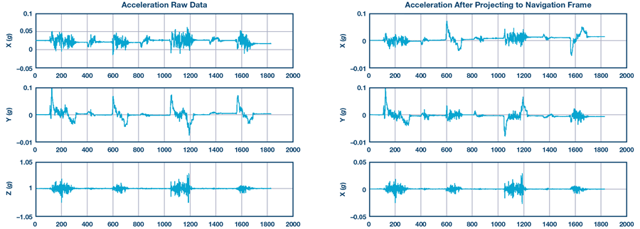 圖10. 體座標系(左)和導航座標系(右)的加速度。