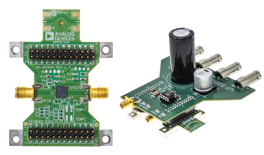 圖 4. Analog Devices 的ADPA1106 評估板(左)和脈衝產生器板(右)。脈衝發生器板包括大型電荷儲存電容器,用於在寬脈衝寬度期間保持功率水平,評估板具有靠近放大器的去耦電容器。