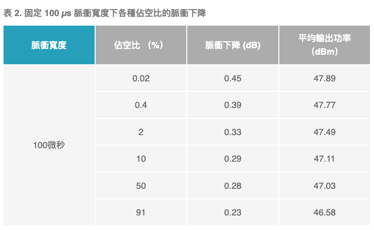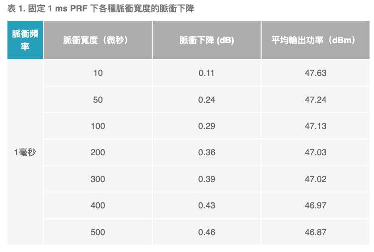 這組數據如圖 6 和表 1 所示,清楚地展示了前面描述的典型脈衝形狀——初始過衝、脈衝形狀穩定和脈衝下降。如預期的那樣,在固定脈衝重複頻率下,增加脈衝寬度和增加脈衝下降之間存在強烈的相關性。在最大測試脈衝寬度下,下降接近 0.5 dB,這是系統級首選的最大下降水準。此外,由於熱效應,我們看到峰值和平均輸出功率隨著脈衝寬度的增加而略有下降。最長脈衝寬度末端的下降斜率略有增加,這可能表明自熱效應開始影響下面的封裝和散熱器的熱管理解決方案。