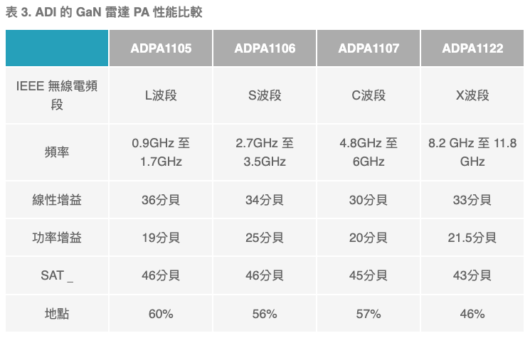 這裡用於測量壓降的 ADPA1106 測試工具是 GaN PA,可在 2.7 GHz 至 3.5 GHz 的頻寬內提供 46 dBm (40 W) 的功率和 56% 的功率附加效率 (PAE)。表 3 總結了 ADI 的一些其他 GaN 雷達 PA 的典型性能。