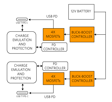 圖 2 展示了雙 USB-PD 系統。對於汽車電池來說,充電時的電壓通常為 14V,在啟動/停止期間最低電壓降至 6V,供電電壓可能在 5V 至 20V 之間變化。電壓調節器提供輸出電壓 V BUS的唯一可能選擇是使用降壓-升壓轉換器。充電模擬並保護 IC 取得 PD 控制器訊號並將其傳遞到 USB Type-C 連接器。