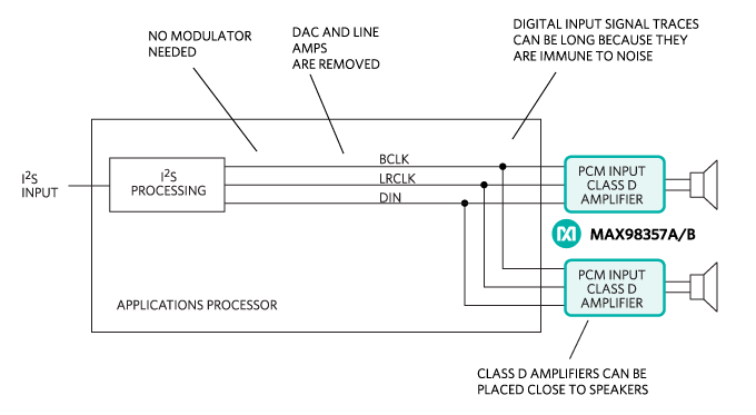 由於其高效率和出色的 EMI 性能,無濾波器數位輸入 D 類放大器已成為消費性電子設備中驅動揚聲器的公認標準。這是因為它們不受與類比對應產品相關的電路板設計問題的影響,尤其是訊號完整性。單聲道數位 D 類擴大機可以放置在電路板上的遠端位置,以最大限度地減少高電流電池和揚聲器負載連接的佈線。這些擴大機不需要類比輸入 D 類設計所需的 DAC 和線路驅動器。因此,空間和系統成本下降,設計變得更簡單。許多 D 類放大器接受脈衝編碼調製 (PCM) 或 I²S 數據,這需要三根線:BCLK、LRCLK 和 DIN(圖 2)。PCM 資料格式不需要應用處理器上的調變器或資料上取樣來提供立體聲資料。