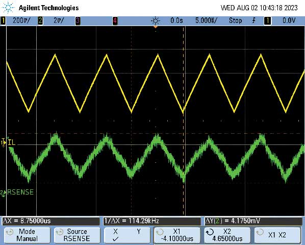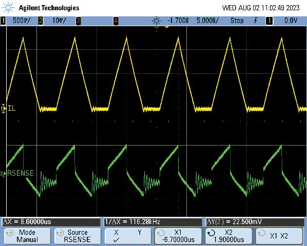 圖11. 過小電感的電流波形。 當電源處於DCM時,電流和RSENSE中存在的震盪。