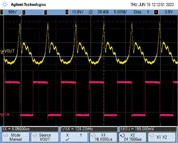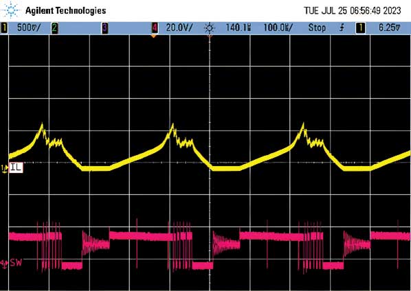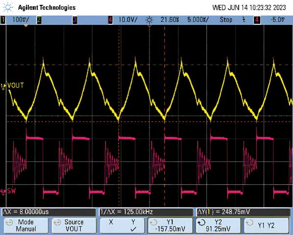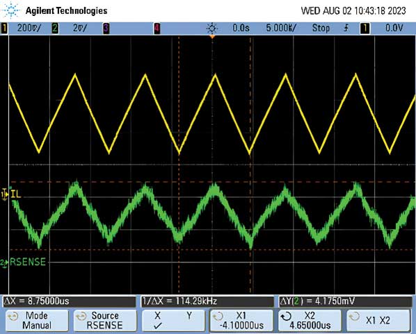 為了緩解此問題,設計師需要牢記,輸出電壓紋波可以通過改變所選擇的輸出電容器來控制。通過增加輸出電容器的值或降低其等效串聯電阻(ESR),可以減少輸出電壓紋波,而無需增加電感的值。這將使電感電流紋波保持在30%至40%之間的值,從而使感測架構能夠正確獲取訊號。這可以在圖15中看到。
