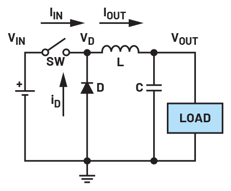 本文僅使用降壓轉換器來展示常見的設計錯誤。降壓轉換器的功率級由四個部分組成:電感、輸出電容、頂部FET(表示為開關)和底部FET(表示為二極管)(見圖2)。