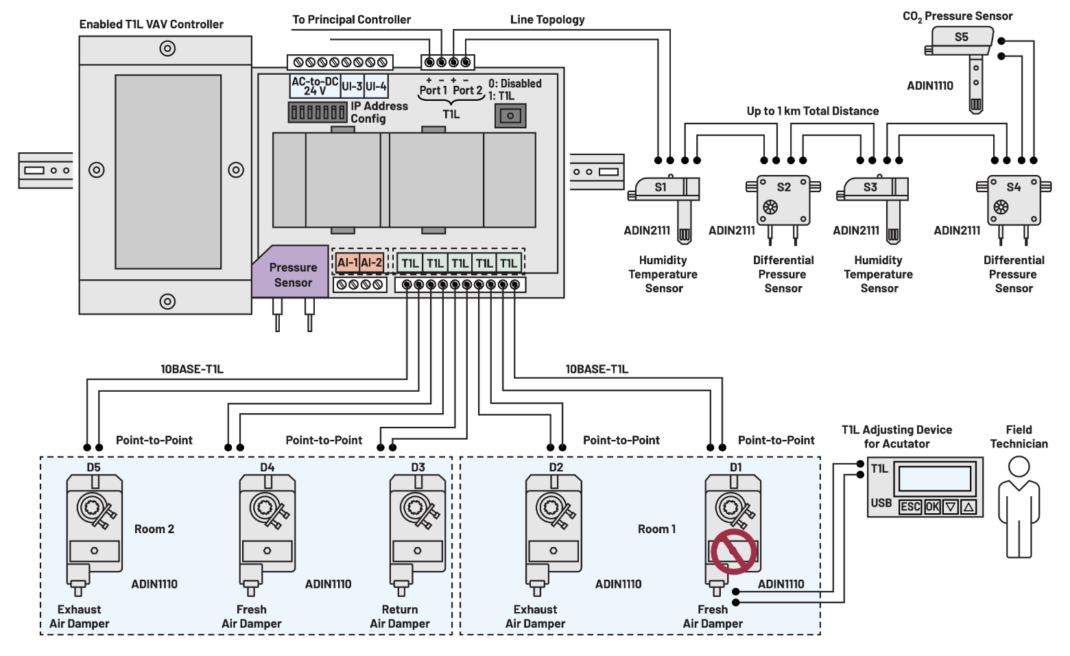 圖 2. 支援 T1L 的 VAV 控制器。