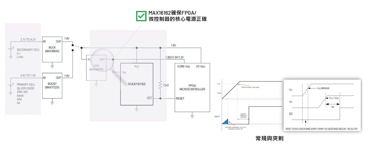 一般而言,監控低電壓並非易事,電壓過低時,傳統電源監控器無法保證正確的重定輸出狀態。圖3電壓流向為電池Battery- >buck/boost->1.8V->LDO->0.85V、1V或1.2V,透過MAX16162進行監控。此產品具有無尖峰脈衝啟動,靜態電流低至825nA,採用精巧的WLP封裝。VCC為0V時,透過復位接腳同步電流,如此既保證了電源電壓為零時重定的有效狀態,又提供了無突刺上電操作。圖3右下角所示為傳統電源監控器與無突刺電源監控器示意,在電源上升期間無突刺電源監控器的復位保持低位準。