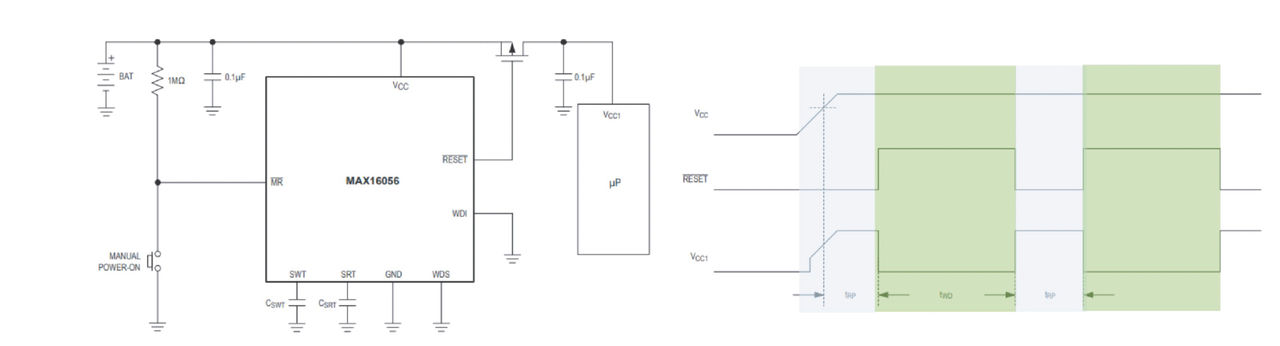 使用整合看門狗計時器的電源監控器會負責監控微處理器或微控制器中的軟體執行,是優化電池供電解決方案的另一種方式。如果微處理器陷入無限執行迴圈,則會透過置位復位或不可遮罩中斷的方式來採取合適的操作。看門狗輸入接腳或WDI上每次由低到高或高到低邏輯變換時,都會使計時器電路清零, 如果計時器在預設的看門狗超時週期(PWT),復位輸出則會置位。為了避免重設,微處理器必須切換WDI接腳。如果微處理器未能在超時週期內切換WDI接腳則會表示發生代碼執行錯誤,產生的重設脈衝將會以已知狀態重新開機微處理器。