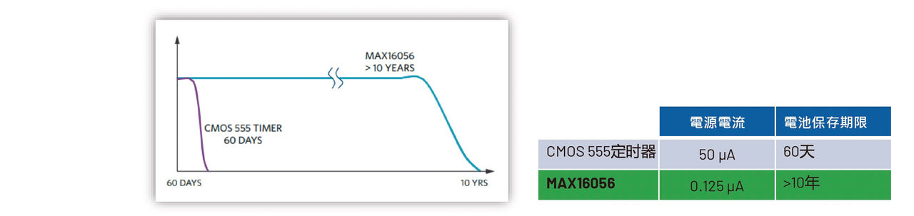圖5是使用CMOS 555計時器和MAX16056建構的振盪器性能比較。使用業界標準CMOS 555計時器建構的類似電路需要約50uA的電源電流,典型CR2016鈕扣型電池的容量為80mAh,因此,555計時器電路可持續使用達約60天。相較之下,MAX16056電路電流消耗為0.125uA,其使用壽命遠遠超過電池的10年儲藏壽命。