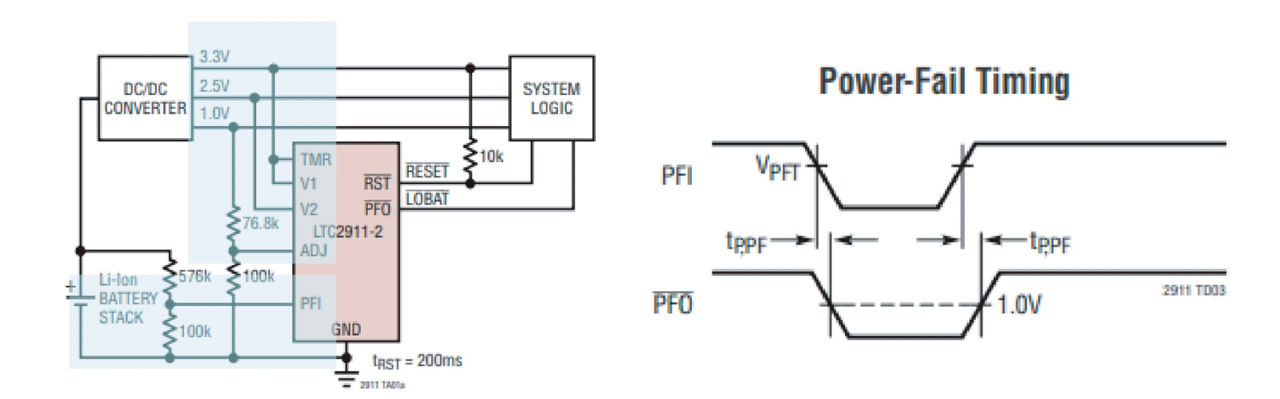 圖6為電源故障預警連接示例,鋰電池堆為系統供電,DC/DC轉換器則提供多個穩壓輸出電壓。該示例中同時監控3路電壓: 3.3V、2.5V和1V,PFI接腳透過分壓電阻直接監控鋰電池堆電壓。如果電源處於故障的邊緣,PFO則將提供預警為系統留出足夠的時間來準備有序關斷。
