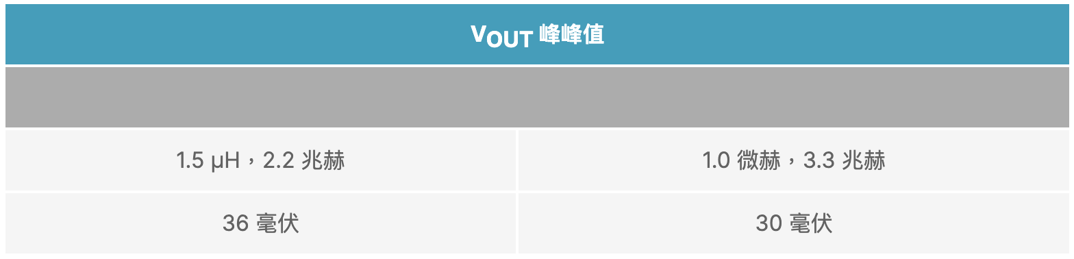 表 2.兩種轉換器設計的峰對峰值電壓比較,適用於0.5 A至1 A至0.5 A負載瞬態