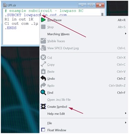 右鍵按下 . SUBCKT 名稱,本例中為lowpass。 選擇 Create Symbol (創建符號),並按下Save(保存)。 請務必將新符號保存至與模型檔相同的目錄中。 參見圖9。