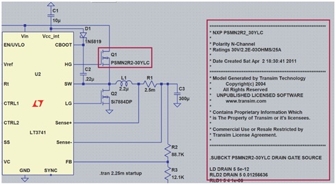 圖5展示範例原理圖,Q1已正確連結到外部 . SUBCKT檔案所定義的模型。 請注意,模型名稱 PSMN2R2-30YLC 已被指定為Q1的值。