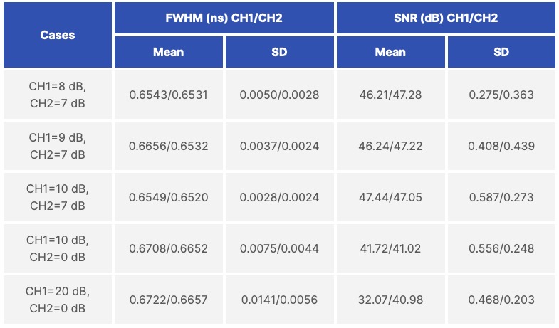 我們量測了所有輸入訊號衰減 1 dB 至 20 dB 的測試案例之 FWHM (半高全寬) 與 SNR (訊噪比)。結果彙總於表 2 (Table 2)。此結果顯示,在各種不同的輸入振幅 (input amplitudes) 下,FWHM 的讀值 (readout) 皆保持一致,這意味著 (suggested) 可實現精確的時間量測。