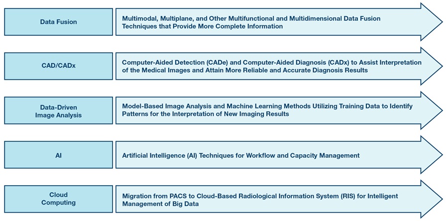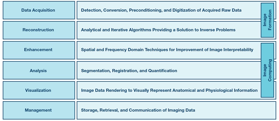 圖像形成過程由數據採集和圖像重建步驟組成,為數學逆問題提供了解決方案。圖像計算的目的是提高重建圖像的可解釋性並從中提取臨床相關信息。最後,圖像管理處理獲取的圖像和派生信息的壓縮、歸檔、檢索和通信。