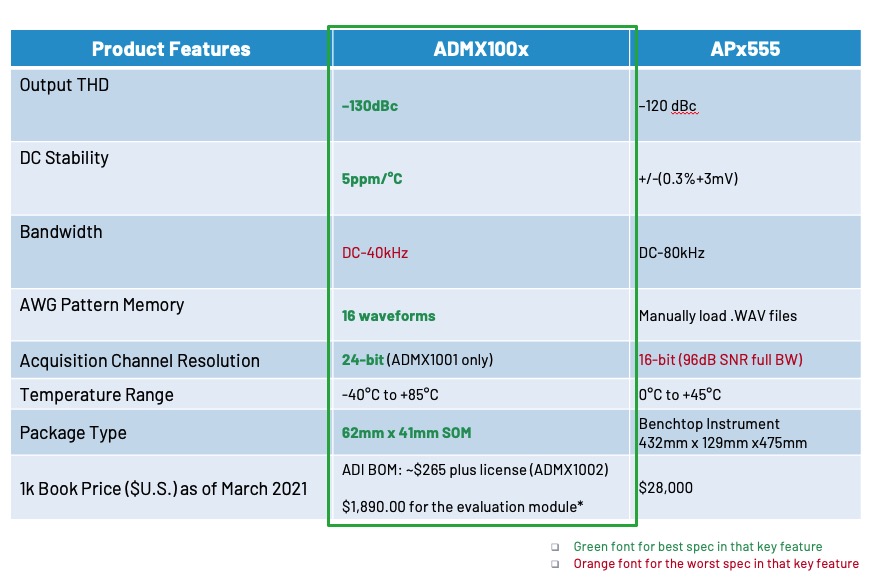 相較於桌上型儀器通常附加許多額外功能(如藍牙、HDMI 介面等),若測試系統不需這些功能,只需要乾淨且高品質的訊號源,ADMX100x 會是更有效率且更具成本效益的替代方案。