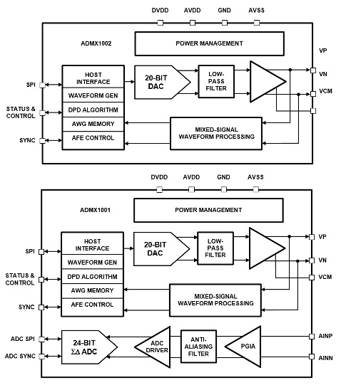 圖 7 顯示 ADMX1002 / ADMX1001 的系統框圖,主要包含: