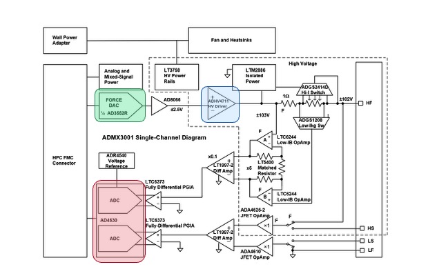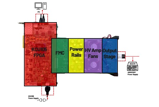 如圖 14 所示,ADMX3001 可與 FPGA(如 Xilinx KCU105)搭配使用,固件燒錄於 FPGA 上,板間透過 FMC 介面連接。電路板布局採用大型電感與電容組成高壓電源軌,高壓放大器則置於大型散熱器與風扇下方,以避免過熱。所有輸出均具備箝位二極體保護。