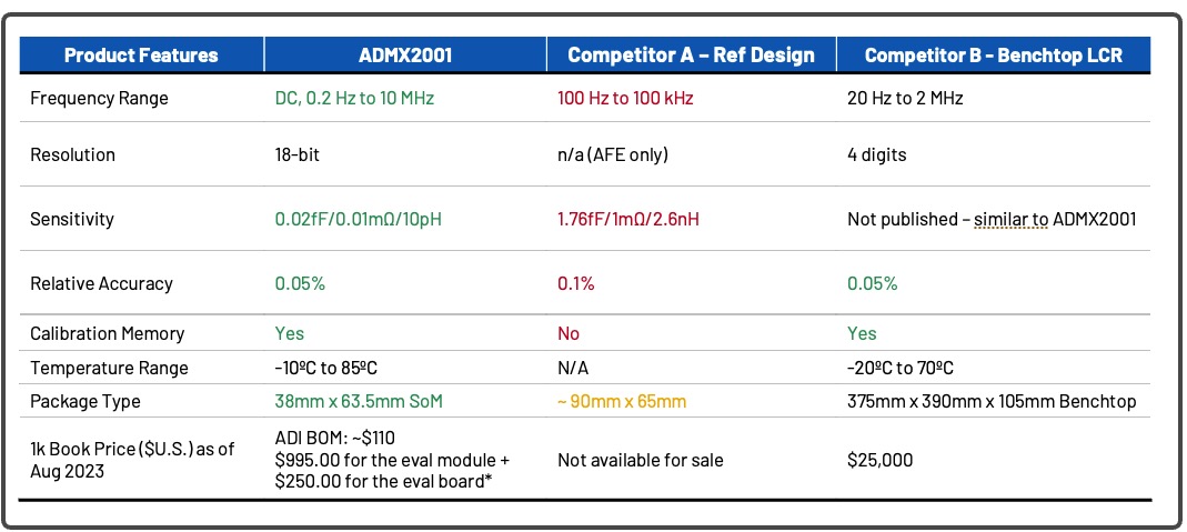 相比其他整合式方案,ADMX2001 在多項指標上具有明顯優勢。表 2 提供一個比較範例,其中以綠色標示的部分代表 ADMX2001 的典型強項,包括量測頻率範圍、靈敏度以及精度等。