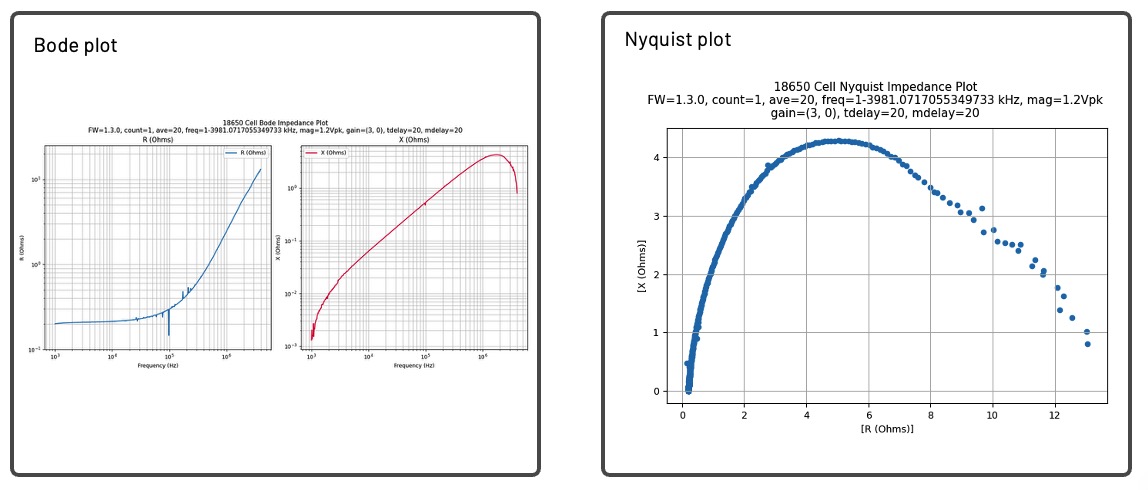 圖 4 為一顆典型 3.7V 18650 鋰離子電池的 EIS(電化學阻抗分析)量測結果。左側顯示的是電阻(Real)與電抗(Imag)隨頻率變化的曲線;將這兩項數據合併繪製到右側的 Nyquist 圖(奈奎斯特圖)後,即可得到完整的阻抗軌跡,用來判斷電池的健康狀態與劣化程度。