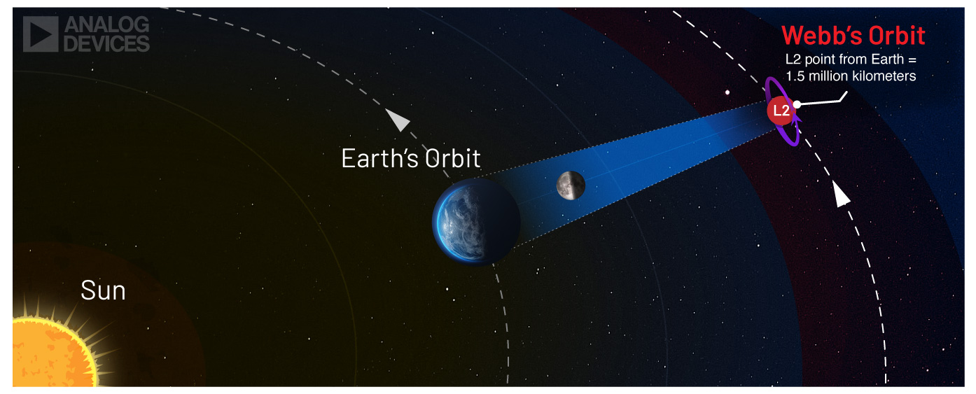 JWST在 L2 的軌道遵循一條路徑,使其在與我們的母行星繞太陽運行時,可以持續停留在地球的夜晚。L2 軌道與天文台的遮陽板相結合,保護 JWST 的敏感儀器免受陽光照射,否則陽光會干擾微弱的信號檢測。