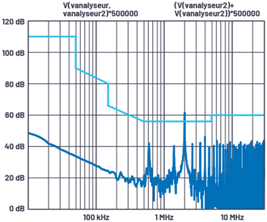 圖 1. 差模和共模雜訊的 LTspice圖,附有傳導輻射限值線