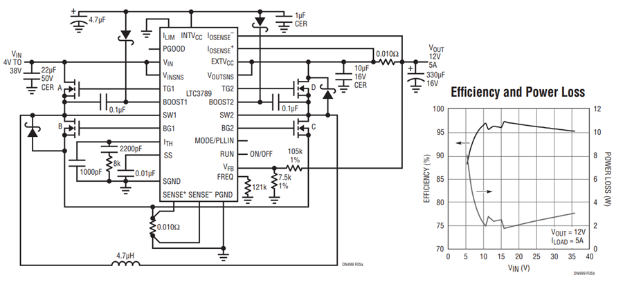圖 5 顯示了一個降壓-升壓穩壓器,它接受 4V 至 38V 輸入並將其轉換為固定的 12V。