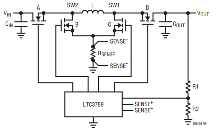 圖 1 顯示了降壓-升壓轉換器的簡化電路圖。LTC3789 控制四個外部 N 通道 MOSFET(A、B、C、D)。功率級使用一個電感 (L) 和一個電流感測電阻 (RSENSE) 用於電流模式控制和電感電流限制。圖 2 至圖 4 顯示了降壓、降壓-升壓和升壓工作模式的開關波形。2