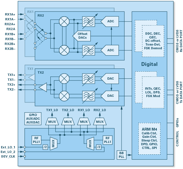 - 2 × 2 高度集成(RF 到數字)收發器兩個獨立的高性能片上 RF LO