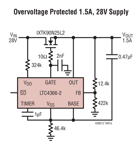LTC4366 突波抑制器可保護負載免受高電壓瞬變的影響。通過控制一個外部 N 通道 MOSFET 的柵極,LTC4366 可在一種過壓瞬變期間調節輸出。