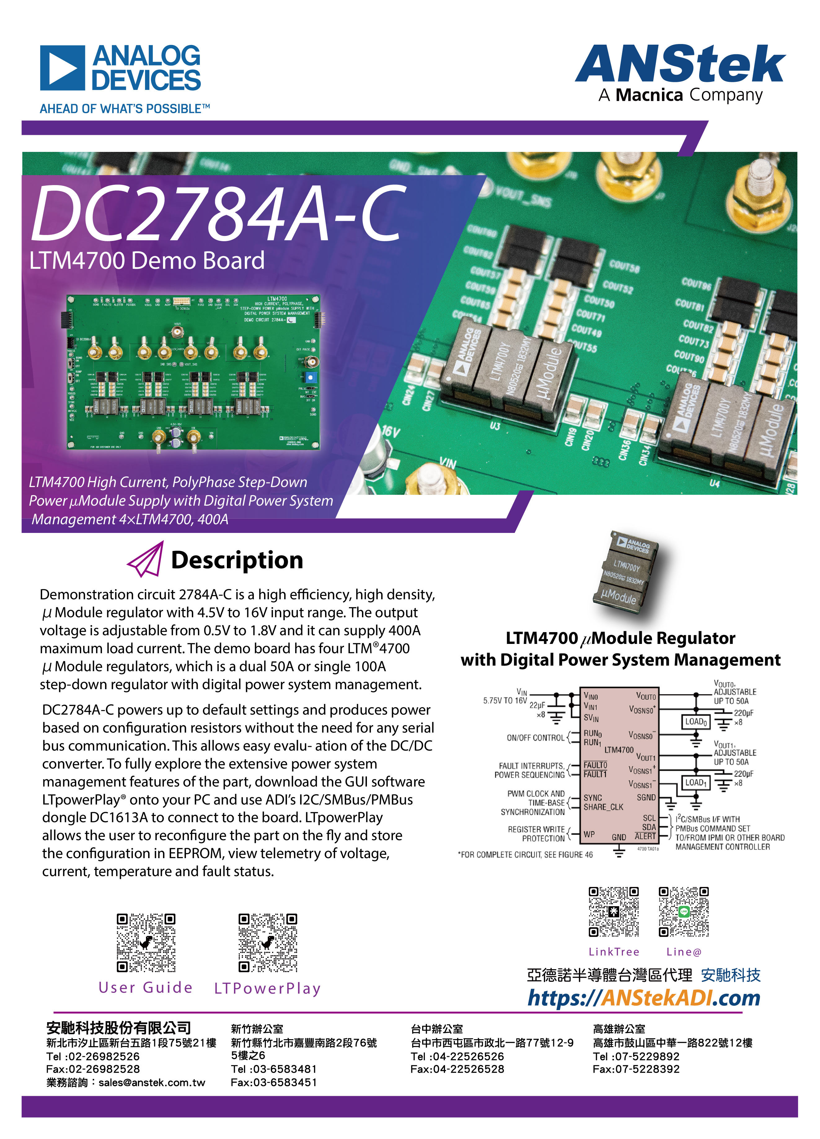DC2784A-C 是一款搭載數位電源系統管理功能的高電流、多相式降壓電源 µModule 電源供應器,使用 4 個 LTM4700 元件,總輸出電流可達 400A。