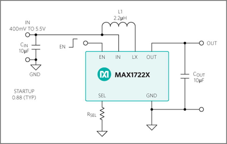 MAX17220–MAX17225為超低靜態電流DC-DC升壓轉換器,擁有225mA/0.5A/1A峰值電感電流限值和真關斷(True Shutdown™)。真關斷功能將輸出與輸入斷開,沒有正向或反向電流。輸出電壓可由一個1%標準電阻選擇。225mA (MAX17220)、500mA (MAX17221/MAX17222/MAX17223)和1A (MAX17224/MAX17225)峰值電感電流限值允許靈活選擇電感。MAX17220/MAX17222/MAX17224版本擁有啟動後使能瞬態保護(ETP),根據負載電流的不同,當輸入電壓下降到400mV以下時,允許輸出保持在穩壓範圍之內。MAX17220–MAX17225擁有超低靜態電流、較小方案總尺寸,在整個負載範圍之內都保持高效。MAX17220–MAX17225可理想用於長電池壽命至關重要的電池應用。